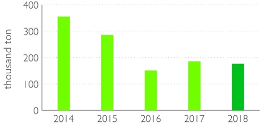 Average ratio of NOx emissions to total raw hydrocarbon production in oil equivalent by KMG Group of companies was 0.2 ton per thousand ton of raw hydrocarbon production in 2018, average IOGP indicator was 0.4. Compared to 2017, there is a 17 % drop in in NOx emissions.