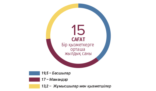Бір қызметкерге академиялық сағаттың орташа жылдық саны 15 сағатты (2019 жылы 17,6 сағат, 2018 жылы 15 сағат), оның ішінде бір ер адамға – 14,6 сағатты (2019 жылы 18 сағат, 2018 жылы 14,9 сағат, 2017 жылы 15,8 сағат), бір әйелге – 16 сағатты (2019 жылы 15,1 сағат, 2018 жылы 15,6 сағат, 2017 жылы 18,3 сағат) құрайды.