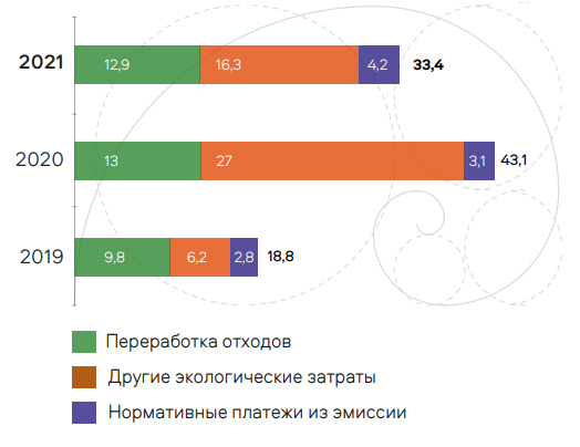 Экологические затраты включают в себя выплату налогов за нормативные эмиссии, затраты на природоохранные мероприятия, страхование, компенсационные мероприятия в области охраны окружающей среды, инвестиции на предотвращения воздействия на окружающую среду и пр. Мы увеличили бюджет на переработку исторических отходов и восстановление загрязненных земель. Инвестиции в переработку отходов начиная с периода 2015 года увеличились в 3 раза и составляют более трети всех расходов на охрану окружающей среды.