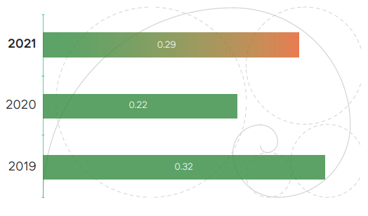 Environmental costs include taxes on permitted emissions, cost of environmental activities, insurance, compensatory environmental measures, investments to prevent environmental impact, etc. We increased the budget for historic waste recycling and contaminated land remediation. Investments in waste recycling tripled since 2015 and make up over a third of all environmental costs. Tax payments for emissions increased in 2021 due to flaring by one of producing SDEs during the test production. Environmental costs in 2021 amounted to 33.4 bln tenge, which is 12 bln tenge more than in 2020. The bulk of costs are from recycling of oil waste, introduction of more environmentally friendly technologies and upgrade of treatment facilities.